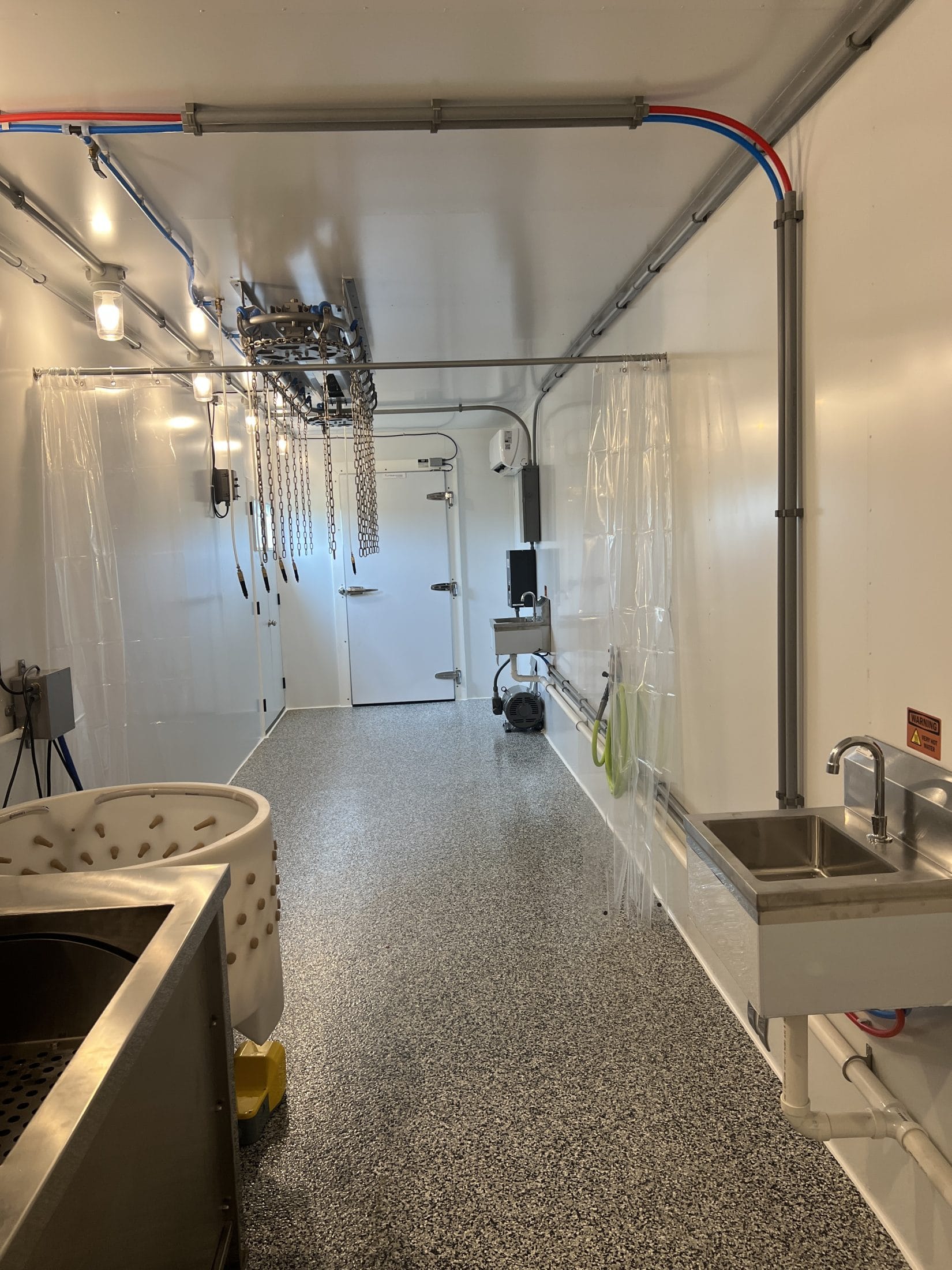 Our 40′ Multi-Species Plant in a Box® offers year-round versatility, combining the essential features of our flagship Poultry Plant in a Box® with upgrades for processing small ruminants. This unit includes reinforced ceilings to support a low-profile, remote-controlled electric winch and a stainless steel four-halves cart, with additional carts available as needed. Perfect for those seeking efficient chicken processing equipment with multi-species functionality.
